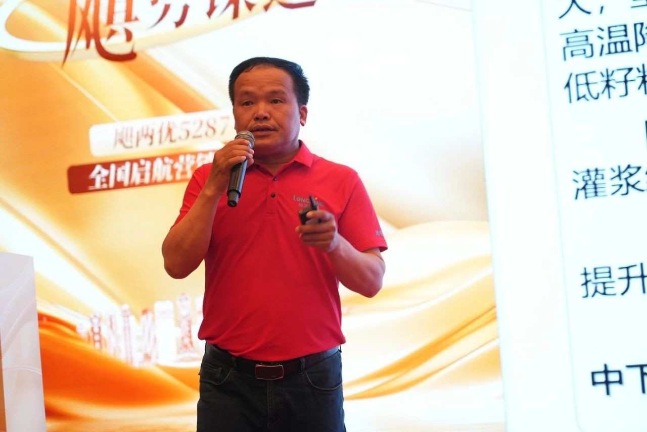 會議伊始,符辰建院長以《颶兩優5287選育進展及后續苗頭組合介紹》為題,系統介紹了颶兩優5287品種來源、特性優勢及高產栽培技術,充分肯定颶兩優5287的市場價值,同時為種植戶增產增收提供了科學方案,進一步堅定了客戶信心。