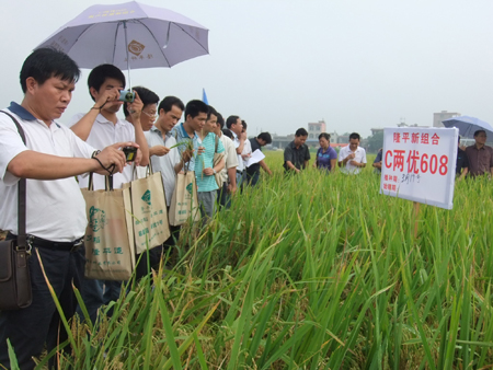7月20日,隆平種業(yè)廣西分公司在玉林市召開了C兩優(yōu)608和Y兩優(yōu)1號的現(xiàn)場觀摩推薦會,來自玉林、欽州、貴港等地的代理商、零售商及農(nóng)業(yè)局部門領(lǐng)導(dǎo)近80人參觀了示范現(xiàn)場。