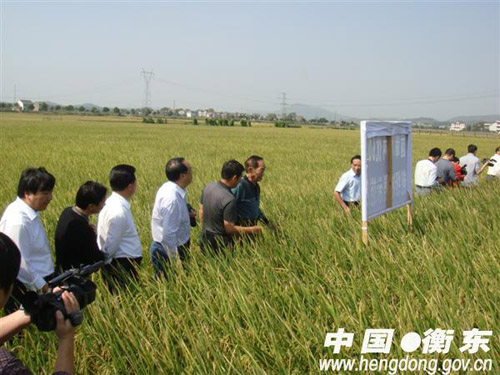 10月15日,秋高氣爽,袁隆平院士蒞臨衡東縣新塘鎮公司準兩優608超級稻百畝示范驗收片考察,國家雜交水稻研究中心副主任馬國輝、衡陽市政協主席王雄飛及各級農業主管領導陪同,公司總經理廖翠猛、常務副總龍和平現場介紹示范片種植情況與品種表現。