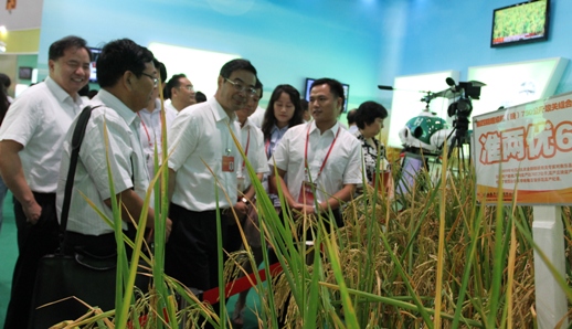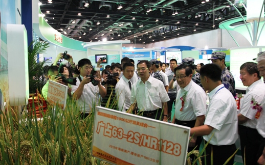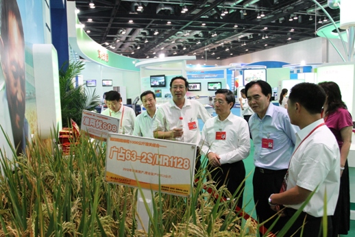 我公司展位居于現(xiàn)代農(nóng)業(yè)產(chǎn)業(yè)板塊,通過“活體水稻+宣傳片+實物(米樣和包裝種子)+宣傳單”的方式,重點展出了袁隆平院士第四期超級稻四個攻關(guān)品種中的63-2S/HR1128和準兩優(yōu)608(晚稻),參展品種全部為我公司擁有的自主研發(fā)產(chǎn)權(quán)品種。展會期間,我司的展臺受到眾多領(lǐng)導關(guān)注,中共中央書記處書記、中央紀委副書記何勇,全國政協(xié)副主席、科技部部長萬鋼,湖南省省委書記、省人大常委主任周強,湖南省委常委、副省長陳肇雄,廣西壯族自治區(qū)黨委書記、區(qū)人大常委會主任郭聲琨,全國政協(xié)常委、廣西壯族自治區(qū)副主席、原中國農(nóng)業(yè)大學校長陳章良等領(lǐng)導來到我司展位,特別關(guān)注了我司的展出項目,饒有興趣地詢問了我司在超級稻育種、推廣等方面的相關(guān)信息,并對我司在雜交水稻育種方面取得成就給予充分的肯定。認為我司利用高新技術(shù)手段,成功研發(fā)高科技含量、高附加值的超級稻新品種,并率先嘗試全程機械化制種等手段引領(lǐng)產(chǎn)業(yè)升級,實現(xiàn)雜交水稻制種的規(guī)?;彤a(chǎn)業(yè)化,為維護我國糧食安全做出了重大的貢獻。