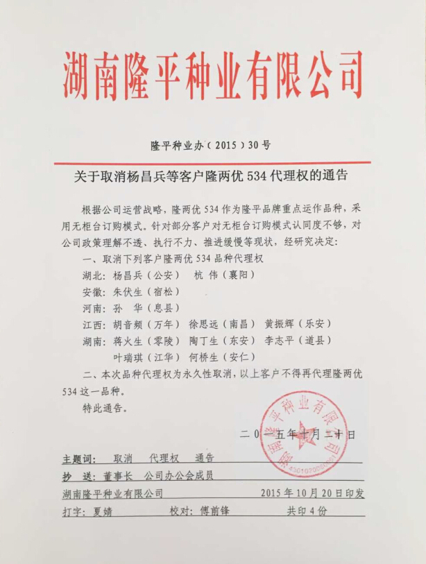 關于取消楊昌兵等客戶隆兩優534代理權的通告