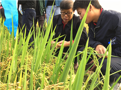 到達徽兩優(yōu)2000和隆兩優(yōu)987示范田塊后,大家看到,跟周邊其他田塊大面積倒伏的情景相比,這兩個品種挺拔的身姿,金黃的稻穗,翠綠的葉片,迎風(fēng)擺動,就連田邊品種展示牌都被風(fēng)吹倒,但這兩個品種依然屹立著,“臨風(fēng)不慌”,顯得格外的引人注目。