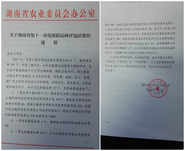 2018年1月8日,湖南省農業委員會公布了湖南省第十一次優質稻品種評選結果,我公司推廣品種晶兩優534、晶兩優510均入選二等優質中稻品種(無一等優質中稻品種),領優華占入選二等優質晚稻品種。